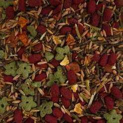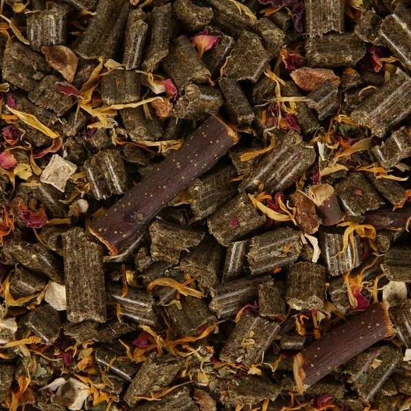 Aufwuchs von Dauergrünland (Wiesenlieschgras, Wiesenschwingel, Wiesenfuchsschwanz, Deutsches Weidelgras, Rotschwingel, Wiesenrispengras, Knaulgras, Honiggras, einjähriges Rispengras, Weiß-Straußgras, Ruchgras, Quecke, Rasenschmiele, Rohrglanzgras, Weißklee, Rotklee, Löwenzahnblätter, Schafgarbenkraut, Spitzwegerich, Wiesenkümmel, Wiesenkerbel, Mädesüß, gewöhnliches Hornkraut, Labkraut, Quendel-Ehrenpreis, Zaunwicke, Beinwell, Acker-Kratzdistel, Gundermann, Gänseblümchen, Gamander-Ehrenpreis, Frauenmantel, große Pimpinelle, schmalblättrige Wicke, Knöllchen-Steinbrech, Frühlingsfingerkraut, Acker-Ehrenpreis, Frühlingshungerblümchen, Herbstlöwenzahn, Rot-Straußgras, Wiesenprimel, kleiner Klee), Ganzpflanzenmais, Wiesenlieschgras, Sonnenblumenextraktionsschrot, Apfelhölzer (5%), Leinextraktionsschrot, Lupinen-Ganzpflanze, Haferschälkleie, Weizenkleie, Rapsextraktionsschrot, Biertreber, Lignocellulose, Bierhefe, Weizenkeime, Leinsamen, Johannisbeerblätter, Pastinaken, Zichorienwurzel, Rosenblüten, Ringelblumenblüten, Topinamburkraut, Amaranth, Spitzwegerich, Löwenzahnblätter, Pfefferminzblätter, Fenchelsamen, Kamillenblüten, Mariendistelkraut, Macawurzel, Salbeiblätter (Gemüse 2%, Blüten 2%)