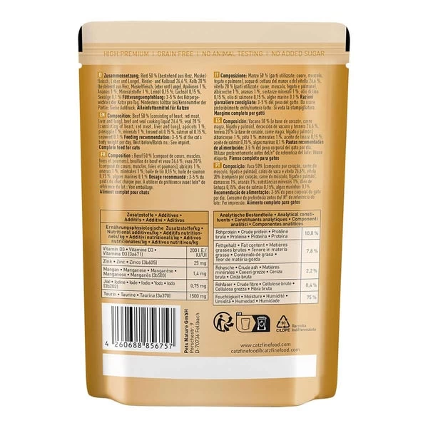 catz finefood verzichtet bewusst auf Formfleisch und Fleischmehle, da frisches Fleisch und Innereien hochwertige Nährstoffe liefern. Zudem ist die ausgezeichnete Feinkost glutenfrei und es werden weder Sojaprotein noch Getreide als billige Füll- oder Fleischersatzstoffe verwendet. catz finefood CLASSIC ist frei von Zuckerzusätzen, künstlichen Farbstoffen, Aromen oder anderen Lockstoffen, denn ein Futter aus hochwertigen Rohstoffen braucht das nicht.