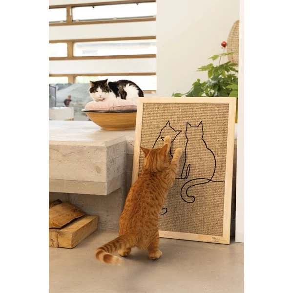 Das Designed by Lotte Kratzbrett Poezels ähnelt mehr einem Gemälde als einem Kratzmöbel. Es ist aus einer Sisalmatte mit einem Rahmen aus Rubberwood gefertigt. Das hell-beige Dekor des Hartholzes und die als Motiv gewählten Katzen passen in nahezu jeden Einrichtungsstil. Mit seiner besonderen Länge bietet das Brett auch ausreichend Kratzfläche für den Stubentiger.