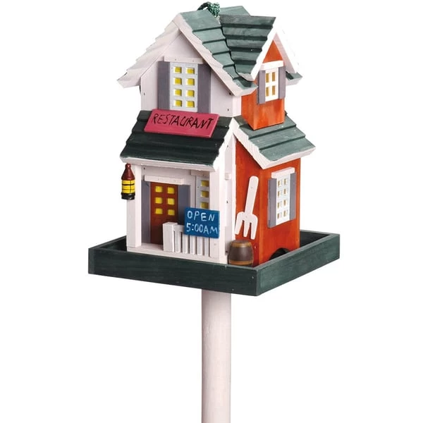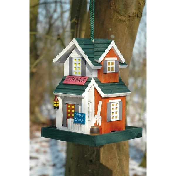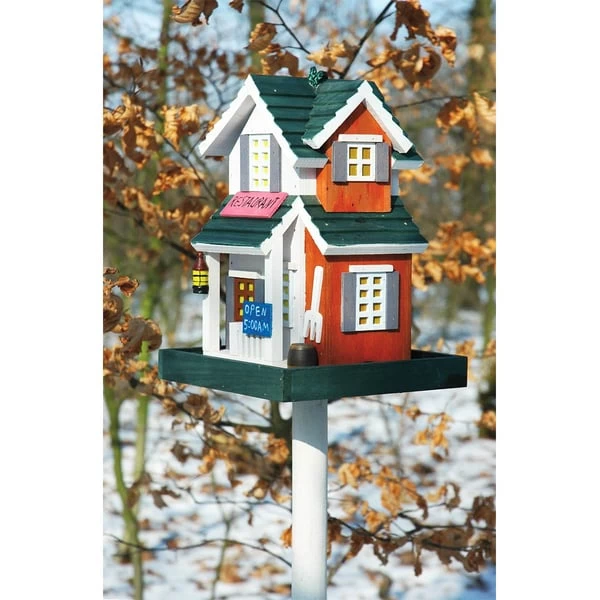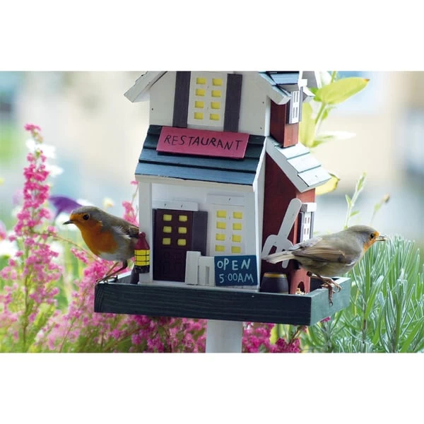 Das ulkig gestaltete Futterhaus im Restaurant-Design lässt Vogelherzen höherschlagen. Es ist unkompliziert über das Dach, welches aufgeklappt werden kann, befüllbar. Außerdem besteht es aus Monterey-Kiefernholz und wurde lasiert, sodass es Regen und Nässe trotzen kann. Über die angebrachte Kordel aufzuhängen oder mit dem Ständer zu befestigen.