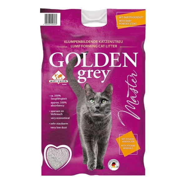 Golden Grey Master Katzenstreu aus feinem, kanadischem Bentonit ist sehr beliebt bei Katzenbesitzern. Durch die Zusätze von Silikat und Babypuderduft sorgt es für eine effektive Geruchsbindung.