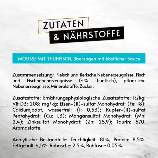 Mit Thunfisch: Fleisch und tierische Nebenerzeugnisse, Fisch und Fischnebenerzeugnisse (4% Thunfisch), pflanzliche Nebenerzeugnisse, Mineralstoffe, Zucker.