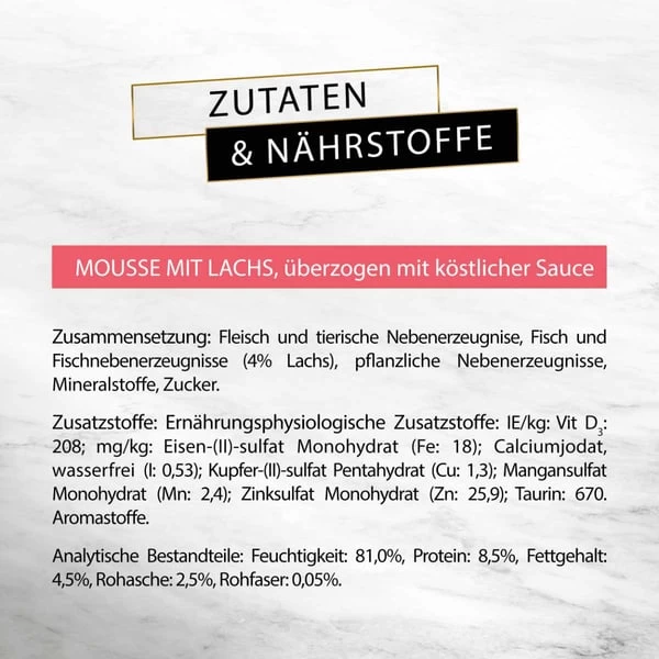 Mit Lachs: Fleisch und tierische Nebenerzeugnisse, Fisch und Fischnebenerzeugnisse (4% Lachs), pflanzliche Nebenerzeugnisse, Mineralstoffe, Zucker.