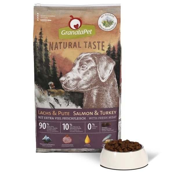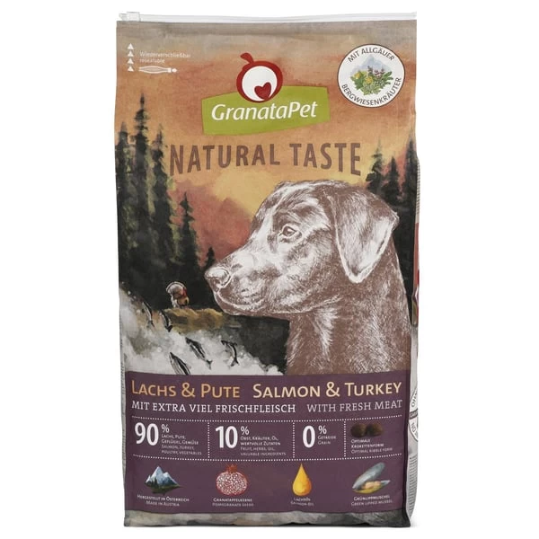 Ente, Forelle und Geflügel 70 % (frisches Entenfleisch 20 %, frische Forelle 15 %, frisches Geflügelfleisch 15 %, Entenfleisch getrocknet und fein vermahlen 5 %, Forelle getrocknet und fein vermahlen 5 %, Geflügelfleisch getrocknet und fein vermahlen 5 %, Geflügelfett 5 %), Gemüse 20 % (Kartoffelflocken, Spinat, Karotten), Granatapfelkerne 4 % (getrocknet und fein vermahlen), Lachsöl 2 %, Mineralstoffe 1,5 %, Vitamine 0,5 %, Allgäuer Bergwiesenkräuter 0,5 % (Bockshornklee, Breitwegerich, Spitzwegerich, Kamille, Löwenzahn, Ringelblume), Chicoree 0,5 % (fein vermahlen, mit natürlichen FOS und Inulin), Kräuter 0,3 % (Pfefferminze, Thymian, Oregano, Salbei, Petersilie, Majoran, Anissamen), Früchte 0,3 % (Cranberrys, Heidelbeeren, Äpfel), Algen 0,2 % (Spirulina, Knotentang), neuseeländische Grünlippmuschel 0,1 % (fein vermahlen, von Natur aus reich an Glucosamin und Chondroitin), Yucca schidigera 0,1 %