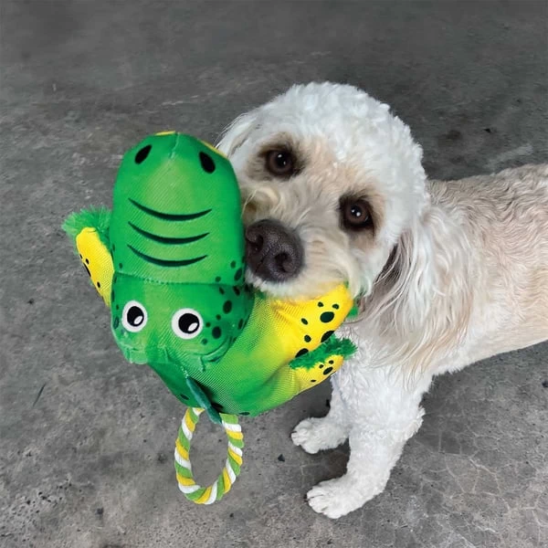 Der Cozie Tuggz Gator hat einen Griff aus robustem Baumwollseil, das im Inneren des Körpers verknotet ist, und somit für Zerrspaß sorgt, der die Instinkte befriedigt. Er quietscht und knistert, damit der gesunde, interaktive Spielspaß länger anhält. Das weiche Plüschfell lädt zu entspannten Kuschelpausen zwischen Zerrspielen ein.