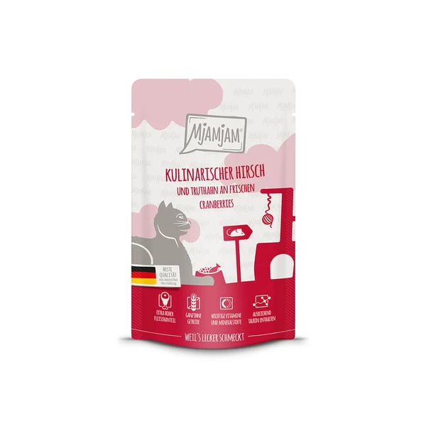 Hirschfleisch 33,5 %, Truthahnfleisch, -leber, -herz 33,5 %, Fleischbrühe 30 %, Cranberries 2 %, Eieerschalen getrocknet 0,5 %, Mineralstoffe 0,5 %