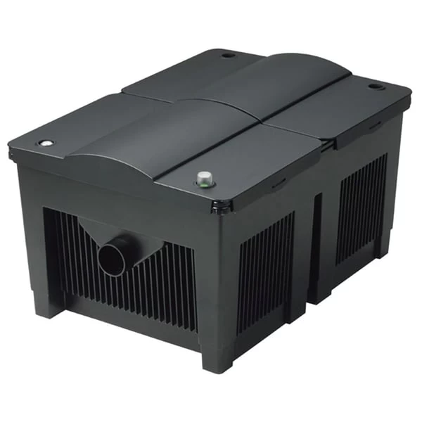 Der OASE BioSmart 36000 ist ein leistungsstarker Durchlauffilter (770 mm lang, 555 mm breit, 405 mm hoch) für Gartenteiche bis zu 36 m³ und Fischteiche bis zu 18 m³. 4 blaue und 4 rote Filterschwämme sowie 1 grüner Filterschwamm sorgen für eine optimale mechanische und biologische Filtrierung. Der Filter mit einer maximalen Durchflussmenge von 8.000 l/h verfügt über zwei Eingänge mit einer Universal-Stufenschlauchtülle von 1″ bis 1½“ und einen DN 75 Ausgang. Optimal kombinierbar mit OASE UVC-Vorklärgeräten Bitron C 24 und 36 W, sowie Vitronic 18-36 W. Zum Säubern hat der Durchlauffilter Reinigungshebel zum Ausdrücken der Filterschwämme, einen Bodenablauf und einen Klarspülanschluss.