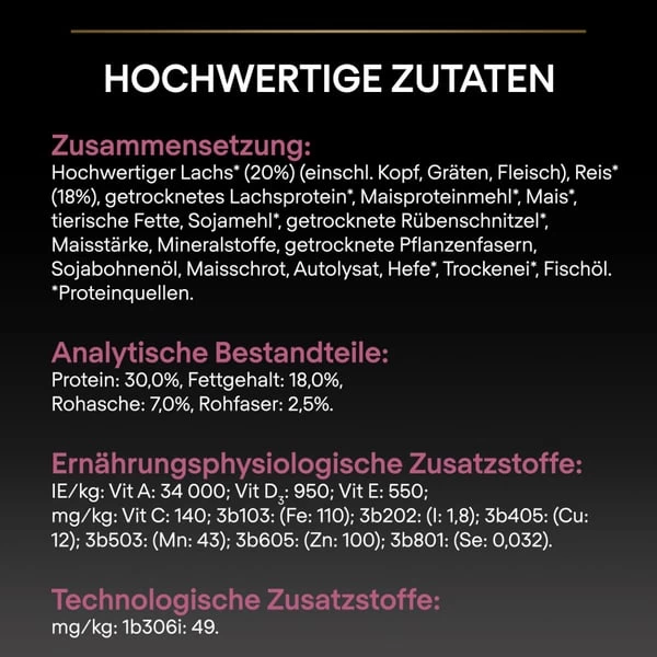 Hochwertiger Lachs* (20%) (einschl. Kopf, Gräten, Fleisch), Reis* (18%), getrocknetes Lachsprotein*, Maisproteinmehl*, Mais*, tierische Fette, Sojamehl*, getrocknete Rübenschnitzel*, Maisstärke, Mineralstoffe, getrocknete Pflanzenfasern, Sojabohnenöl, Maisschrot, Autolysat, Hefe*, Trockenei*, Fischöl. *Proteinquellen.