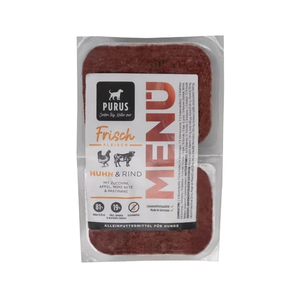 39 % Rindermuskelfleisch, 15 % Rinderherz, 6 % Rinderleber, 2 % Rinderlunge, 2 % Rinderniere, 2 % Rindermilz, 13 % Rinderknochen, 7 % Kartoffel, 3% Pastinake, 3 % Karotte, 3 % Apfel, 3 % Rote Bete, 1 % Raps- & Lachsöl, 1 % Mineralien (Algenkalk, Bierhefe, Malzkeime, Seealgenmehl, Traubenkerne extrahiert)