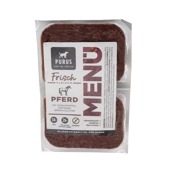 43 % Pferdemuskelfleisch, 11 % Pferdeherz, 7 % Pferdeleber, 5 % Pferdelunge, 8 % Pferdeknochen, 12 % Süßkartoffel, 5 % Pastinake, 4 % Birne, 3 % Zucchini, 1 % Raps- & Lachsöl, 1 % Mineralien (Algenkalk, Bierhefe, Malzkeime, Seealgenmehl, Traubenkerne extrahiert)