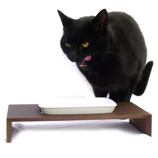 Auch Samtpfoten werden jetzt im REPLUS Sortiment fündig. Ab sofort gehört eine vornehme Futterstation für Katzen zum Programm. Eine ästhetische Kombination von Holz und Porzellan.