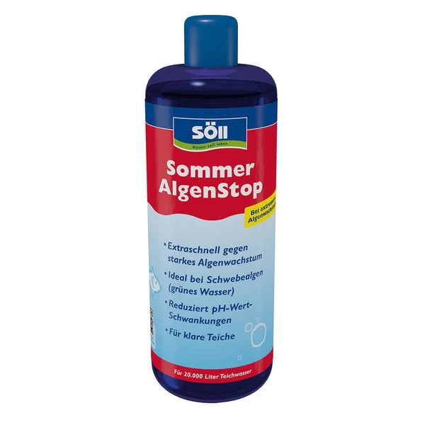 Das Söll SommerAlgenStop bekämpft rasch und gezielt den Organismus und Stoffwechsel der Algen. Die spezielle Wirkstoffkonzentration und die Zusammensetzung befreien Ihren Gartenteich im Sommer in kürzester Zeit. Nährstoffreiches Wasser, viel Licht und Wärme sind für den Algenbefall ausschlaggebend. Das Gewässer wird unansehnlich und ist zugleich Gefahrenherd für seine Bewohner: Sind viele Algen vorhanden, findet auch viel Photosynthese statt. Der pH-Wert schwankt so sehr, dass er sich negativ auf das Wohlbefinden der Fische auswirkt. Sorgen Sie mit dem Söll SommerAlgenStop für einen gepflegten und tierfreundlichen Teich. Wahlweise erhalten Sie das Söll SommerAlgenStop in den Varianten 500ml oder 1l.