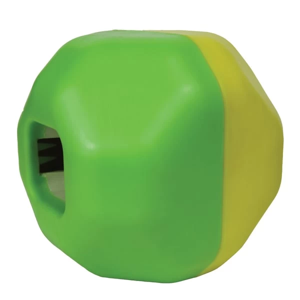 Der Treat Dispensing Puzzle Ball ist ein Puzzlespielzeug mit unterschiedlichen Schwierigkeitsstufen für Welpen wie auch ausgewachsene Hunde. Das Vierkammer-System fordert den Hund auf besondere Weise heraus. Die einzelnen Kammern sind miteinander verbunden, jedoch gibt es nur eine Öffnung nach außen. Befüllt man die Kammern mit den Interactive Treats oder anderen Leckerlis, muss sich der Vierbeiner diese durch geschicktes Rollen des Balls freispielen. Je nachdem, in welcher Kammer sich die Leckerei befindet, ergibt sich ein anderer Schwierigkeitsgrad. Durch seine Form rollt der Ball in willkürliche Richtungen. Die gummierte, äußere Beschichtung verhindert das Verrutschten und reduziert Geräusche während des Spiels.