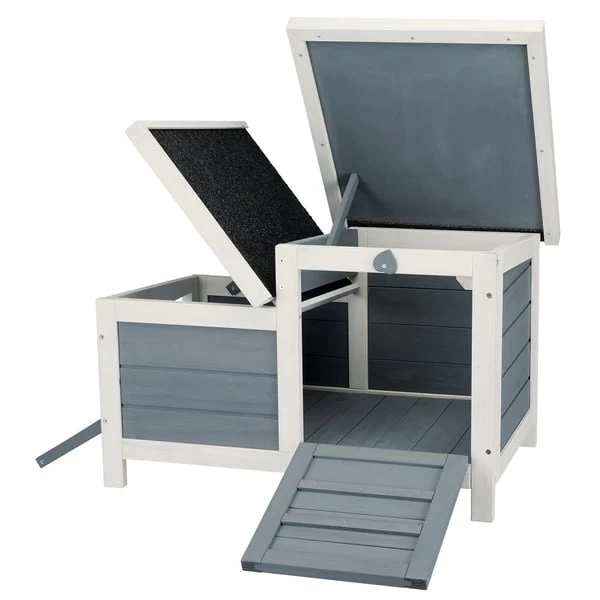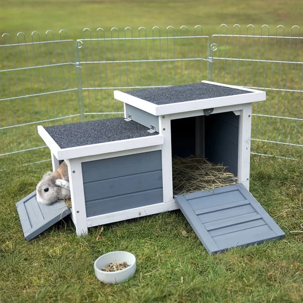 Das Kleintierhaus von Trixie ist dank des lasiertem Kiefernholt wetterfest. Das Dach ist mit besandeter Dachpappe bedeckt und lässt sich zugleich bequem öffnen. Es eignet sich optimal zur Aufstellung in verschiedenen Freilaufgehegen. Alle Türklappen können separat verschlossen werden. Die Beine schützen vor Bodenfeuchte sowie –kälte und sorgen gleichzeitig für eine gute Luftzirkulation unterhalb des Hauses. Die beiden Ein- bzw. Ausgänge garantieren eine tiergerechte Haltung.