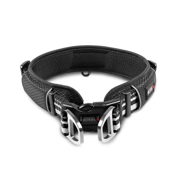 Das WOLTERS Active Pro Hundehalsband ist für Hunde ganz besonders angenehm zu tragen. Das Halsband ist komplett gepolstert und mit einem atmungsaktiven Mesh-Gewebe überzogen. Um den empfindlichen Hals des Hundes zusätzlich zu schützen, wurde eine weitere Polsterung im Kehlkopfbereich vernäht. Die Anleinringe befinden sich direkt am Schnellverschluss des Halsbandes, sodass auch bei Zug an der Leine nichts auf diesen empfindlichen Bereich drücken kann. Durch die reflektierenden Nähte ist der Hund auch bei Dämmerung und Dunkelheit gut zu sehen. Das geringe Eigengewicht sorgt für einen superleichten, angenehmen Tragekomfort. Ein zusätzlicher Ring bietet Platz für die Hundemarke und einen Adressanhänger.