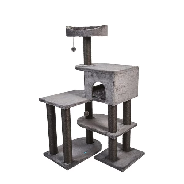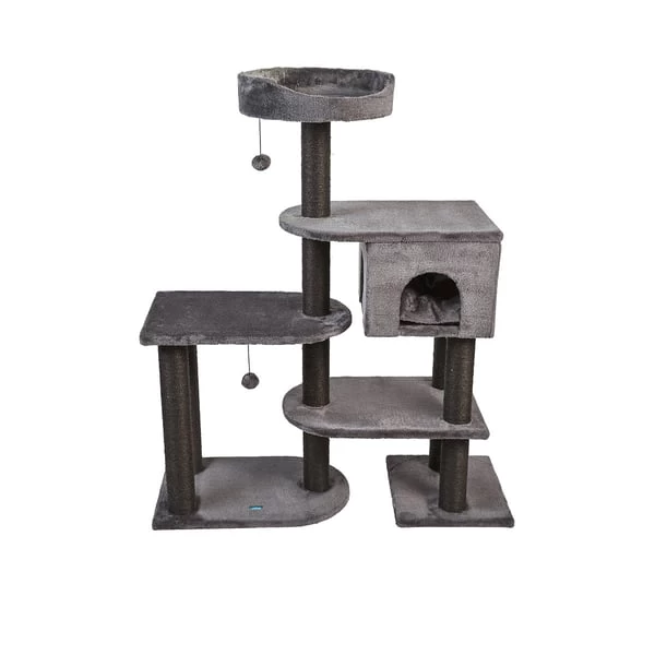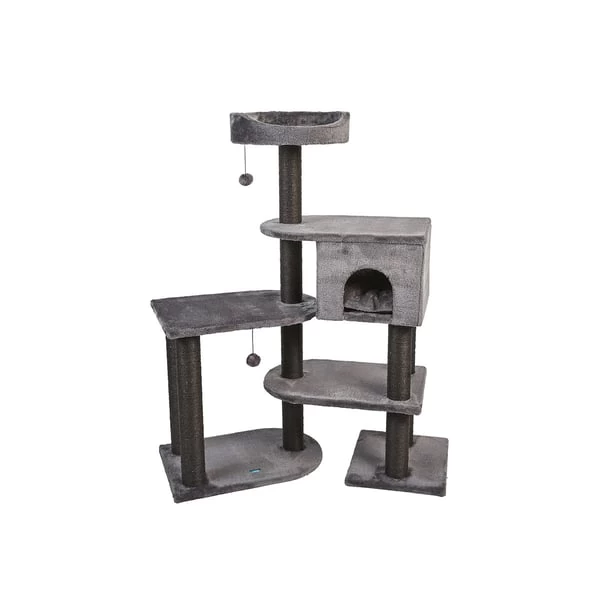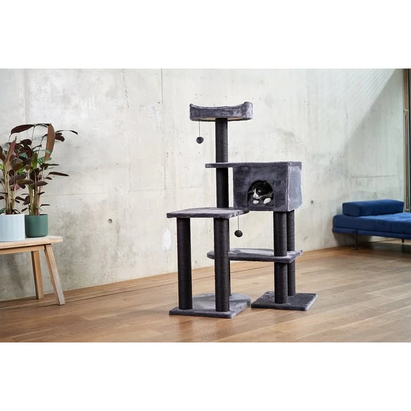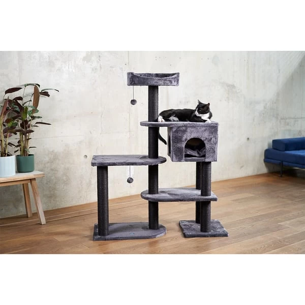 - Mit 4 Liegeflächen, einer Höhle und Kratzstämmen aus Sisal